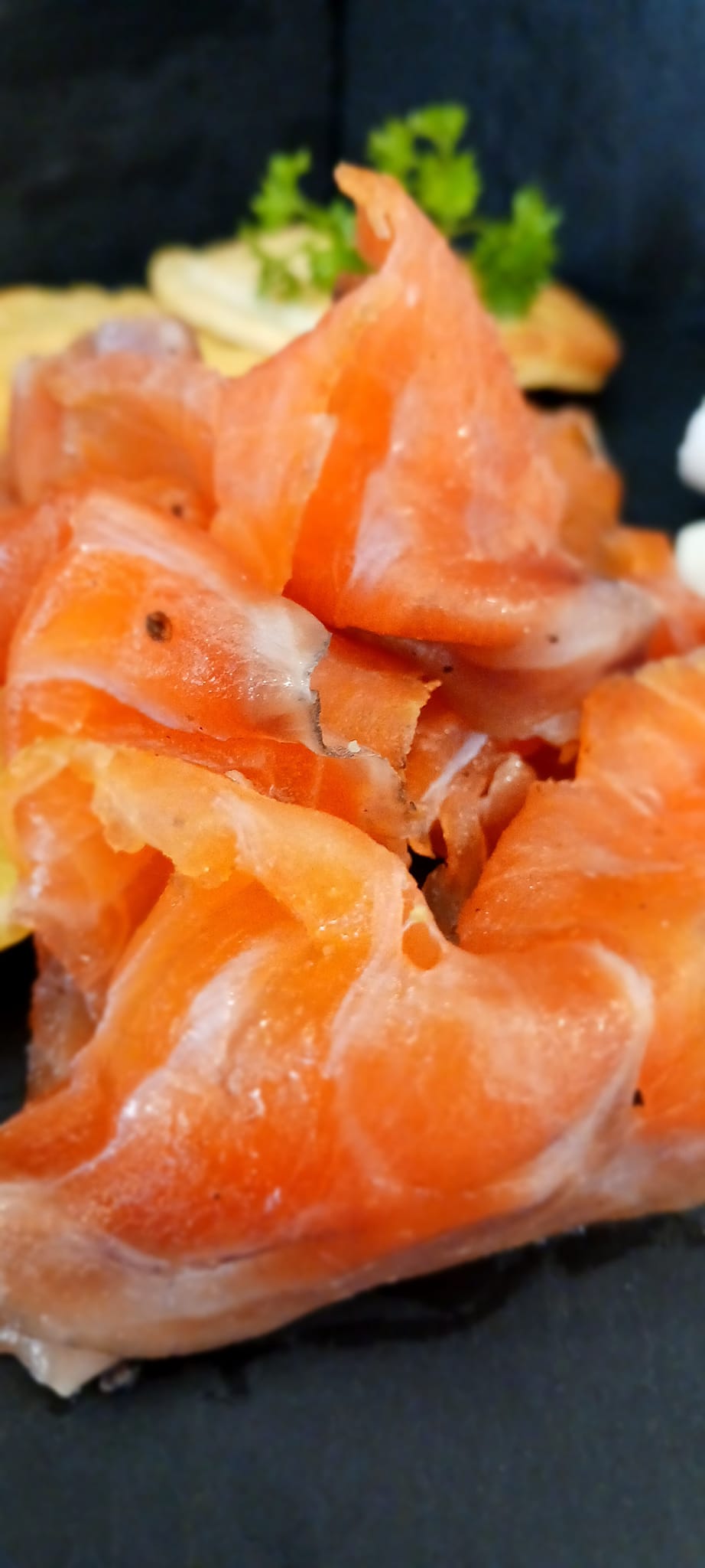 Le saumon est salé pendant 6 heures, puis assaisonné aux baies des Bataks — des baies rares au parfum d’agrumes — avant d’être fumé au bois de hêtre, deux fois 10 heures, pour un goût délicatement équilibré.
